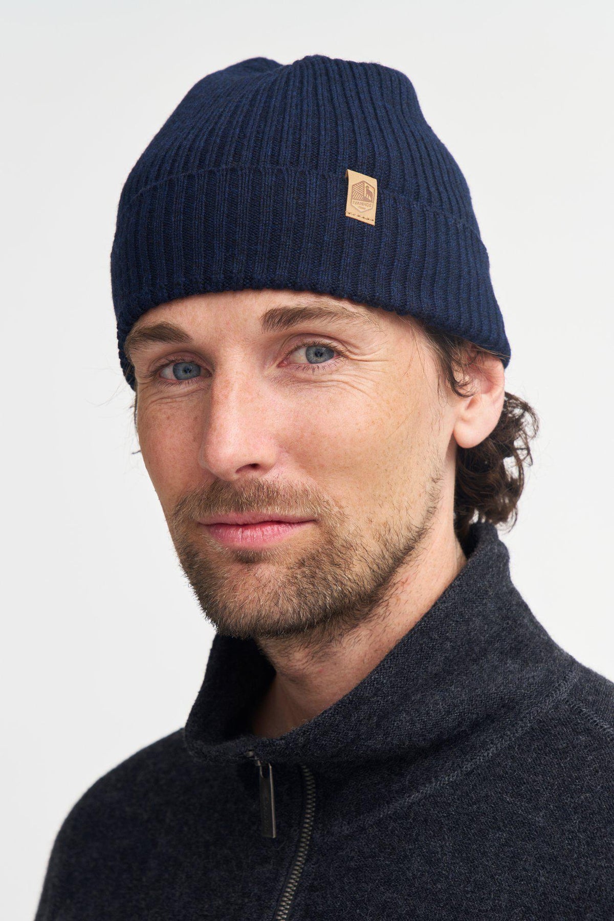 Ribbstickad mössa med uppvik stickad i 100% mjuk merinoull. Liten logo-badge vikt runt kanten. One size.