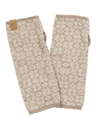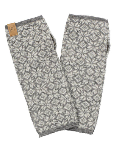 Gråmelerad mössa med uppvikt kant och traditionellt mönster i naturvitt, tillverkad i grovstickad ull, liggande mot vit bakgrund.