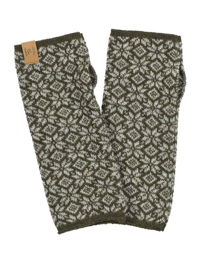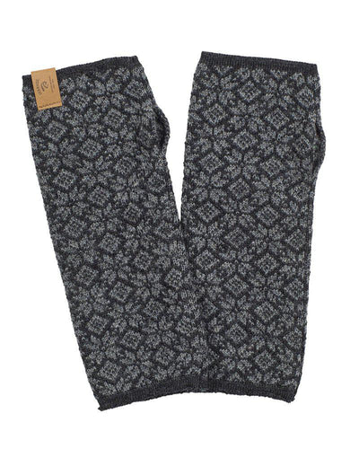 Mörkgrå halsduk med ljust snöflingemönster i romber, vikt dubbelt och placerad mot vit bakgrund.