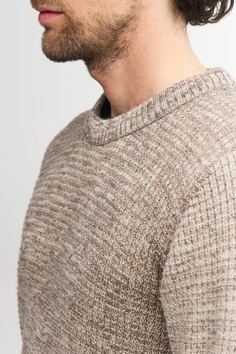 Classic crew neck style knitted in 100% pure undyed wool. Structure knit on body, rib knitted cuffs down and arms and down at body. A timeless classic that will give you many years of enjoyable use.