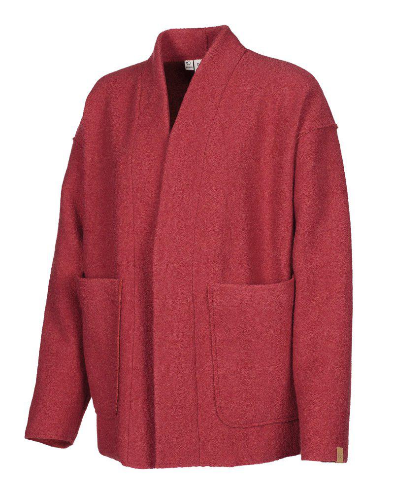 Open jacket in 450g boiled wool. Genereous side pockets, raw edges and seams for extra design effect. Oversize in fit and with a small, tasteful logobadge down on left arm opening.