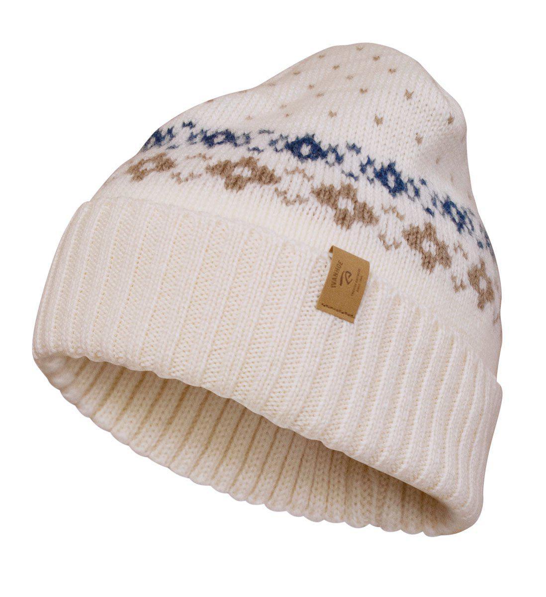 Vit mössa med vikt kant och mönster i blått och beige, fotograferad mot vit bakgrund.