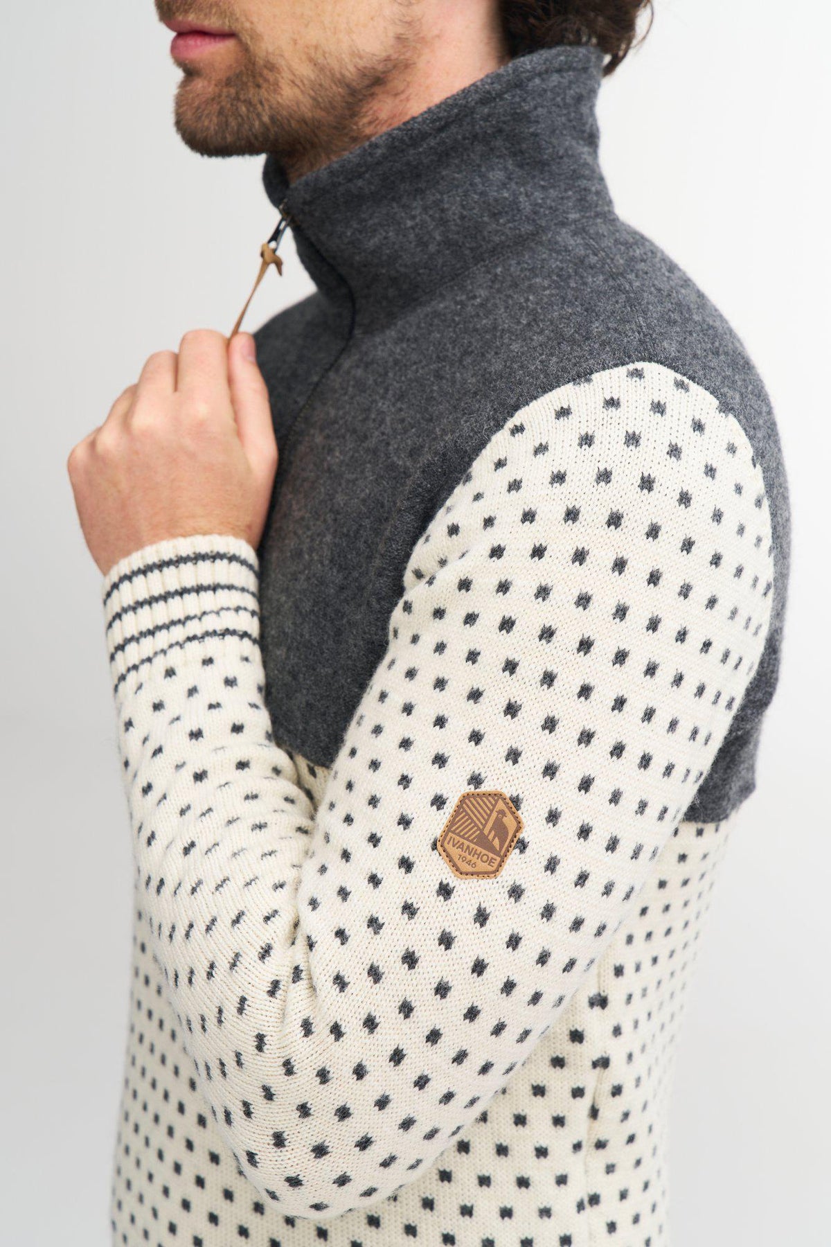 Robuster Pullover mit Reißverschluss und einzigartigem Design, bei dem gewalkte Wolle mit gemusterten Strickteilen kombiniert wird. Das Design hat einen klassischen skandinavischen Touch und wird lange Zeit ein Favorit in Ihrem Kleiderschrank sein.