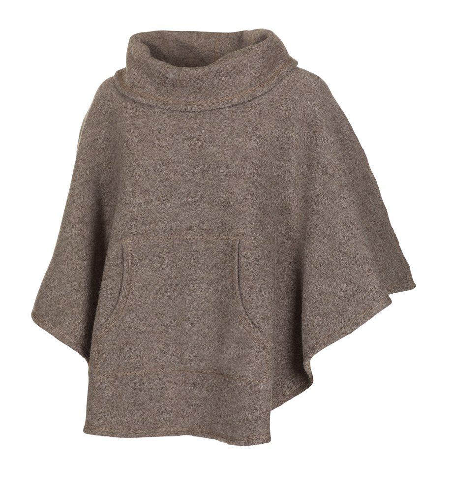 Poncho mit Kängurutasche auf der Vorderseite und großem, drapiertem Kragen. Super gemütlich! 450g gewalkte Wollqualität aus 100% ungefärbter Schurwolle.