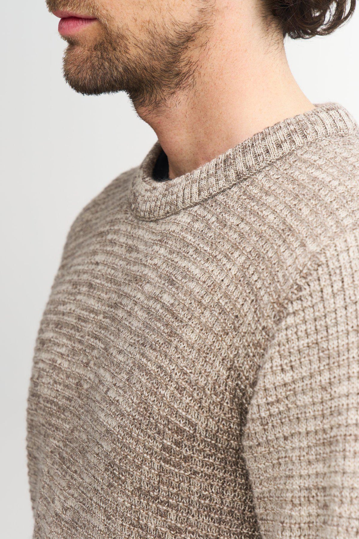 Klassischer Pullover mit Rundhalsausschnitt aus 100% ungefärbter Schurwolle. Strukturstrick am Körper, Rippstrickbündchen am Kragen, an den Armen und unten am Körper. Der Pullover ist sehr leicht und bequem - ein zeitloser Klassiker, an dem Sie viele Jahre Freude haben werden.