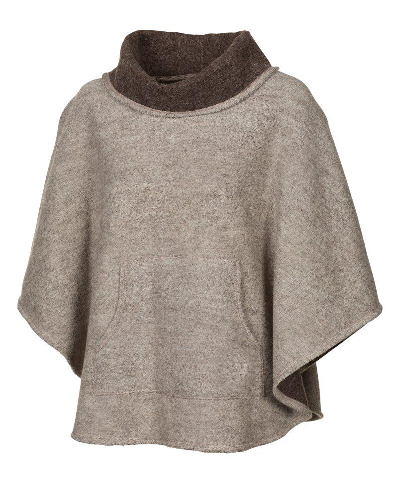 Poncho mit Kängurutasche auf der Vorderseite und großem, drapiertem Kragen. Super gemütlich! 450g gewalkte Wollqualität aus 100% ungefärbter Schurwolle.