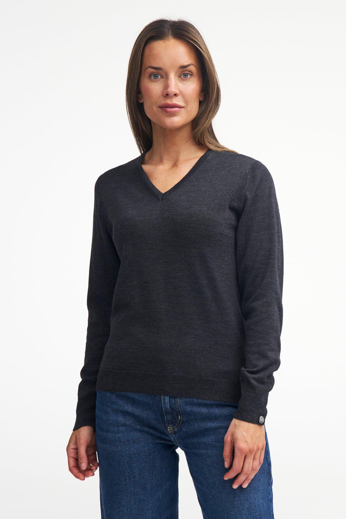 V-neck style in a thin, soft and comfortable fine Merino wool with the feeling of cashmere. Basic colours in stock all year around (black, navy and grey) and additional colours in season. Ivanhoe badge down at left arm.